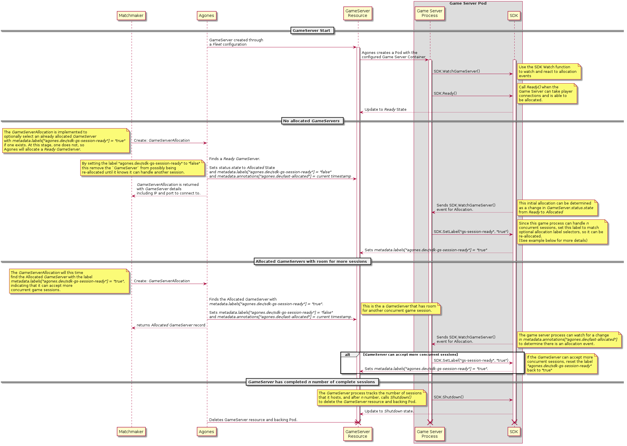 Utilising the allocation gameServerState filter as well as the existing ability to edit the GameServer labels at both allocation time, and from within the game server process, via the SDK, means Agones is able to atomically remove a GameServer from the list of potentially allocatable GameServers at allocation time, and then return it back into the pool of allocatable GameServers if and when the game server process deems that is has room to host another game session.